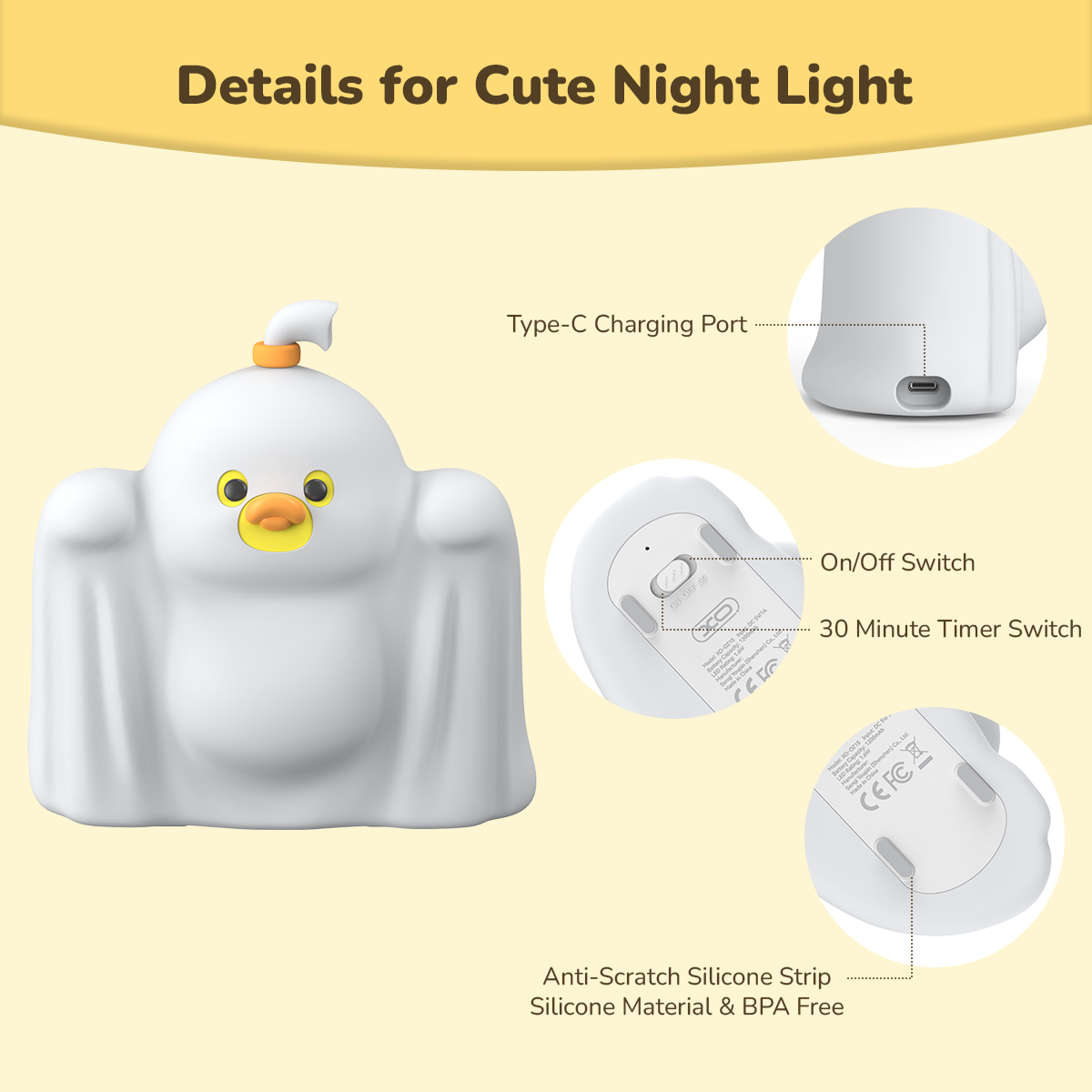 Chất Liệu Silicon "Mềm Như Bánh": Được làm từ đèn ngủ silicon an toàn, không chứa BPA. Mềm mại, đàn hồi, không sợ rơi vỡ, và cực kỳ thích hợp để đặt cạnh giường hoặc cho bé ôm (đèn ngủ hình Vịt/Ma).