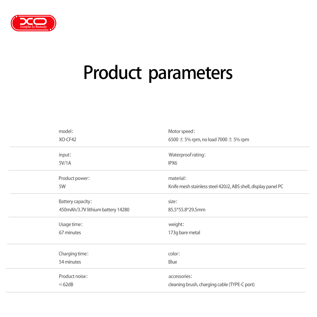 Mặc dù có tên gọi là "máy nhổ lông" để dễ tìm kiếm, nhưng XO CF42 thực chất là một chiếc máy cạo lông hiện đại với lưỡi dao được làm từ thép không gỉ 420J2 cao cấp. Với tốc độ quay mạnh mẽ lên đến 7000 vòng/phút, máy giúp loại bỏ lông một cách nhanh chóng, nhẹ nhàng mà không gây cảm giác đau hay khó chịu.