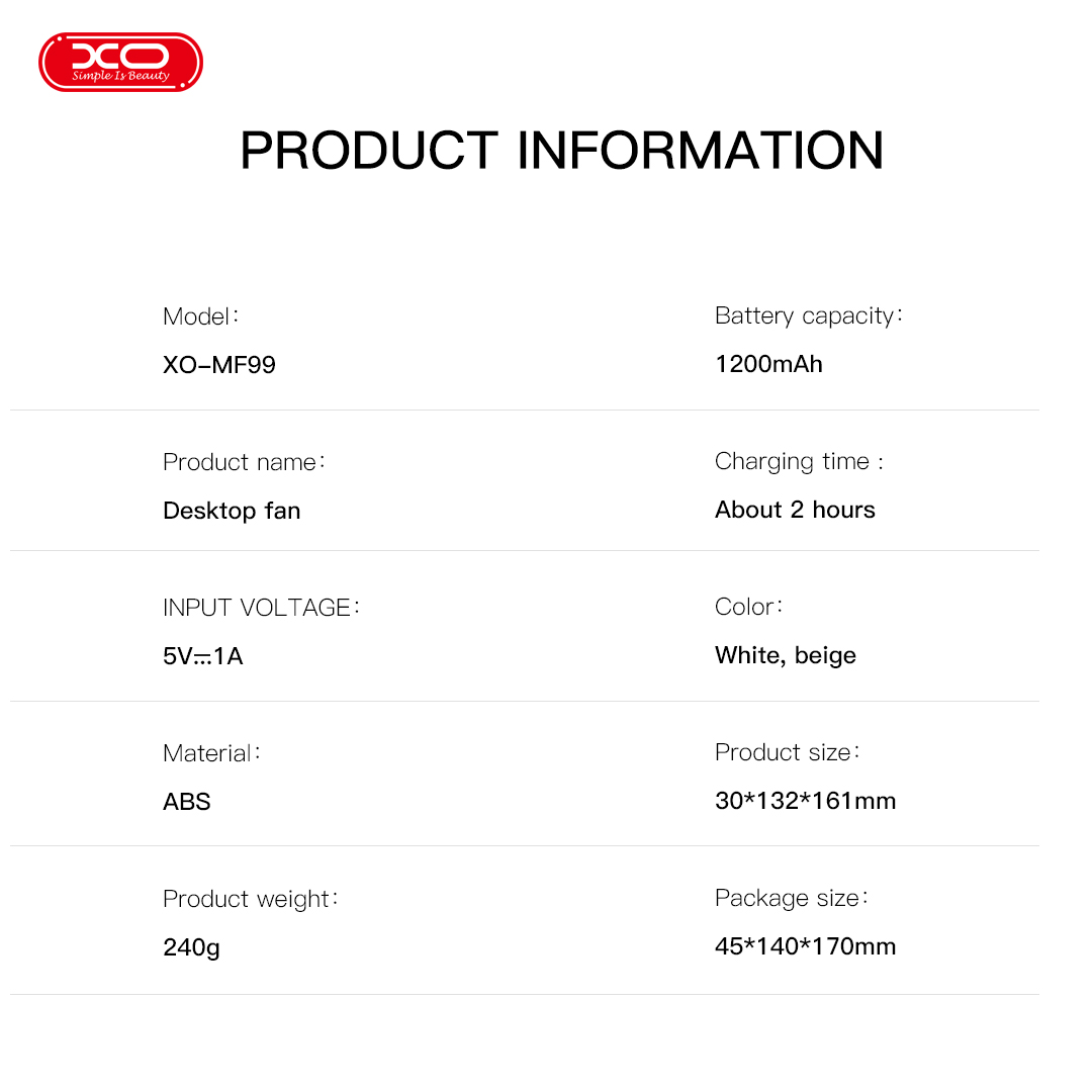 Quạt mini để bàn XO MF99 - Gấp gọn, màn hình LED, pin 1200mAh