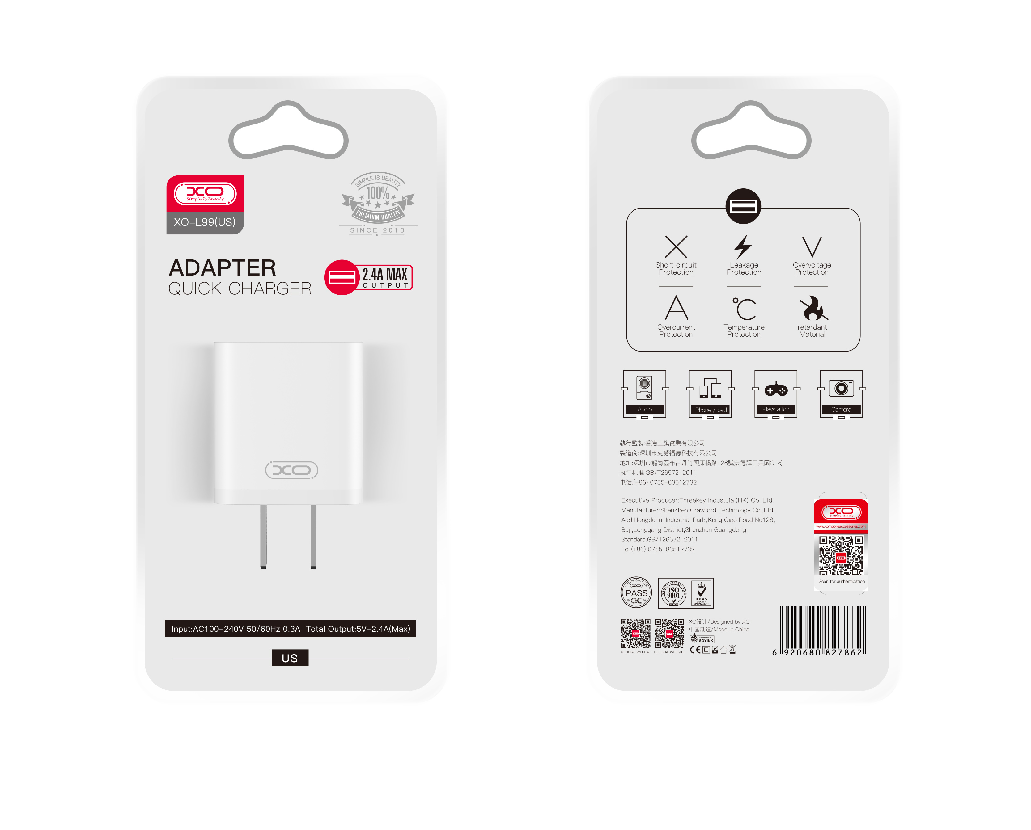 Bộ Sạc XO L99 – giải pháp sạc nhanh và an toàn cho mọi thiết bị di động của bạn. Với công suất tối đa 2.4A, XO L99 giúp sạc thiết bị của bạn một cách hiệu quả và an toàn, đồng thời bảo vệ thiết bị khỏi các nguy cơ về nguồn điện.