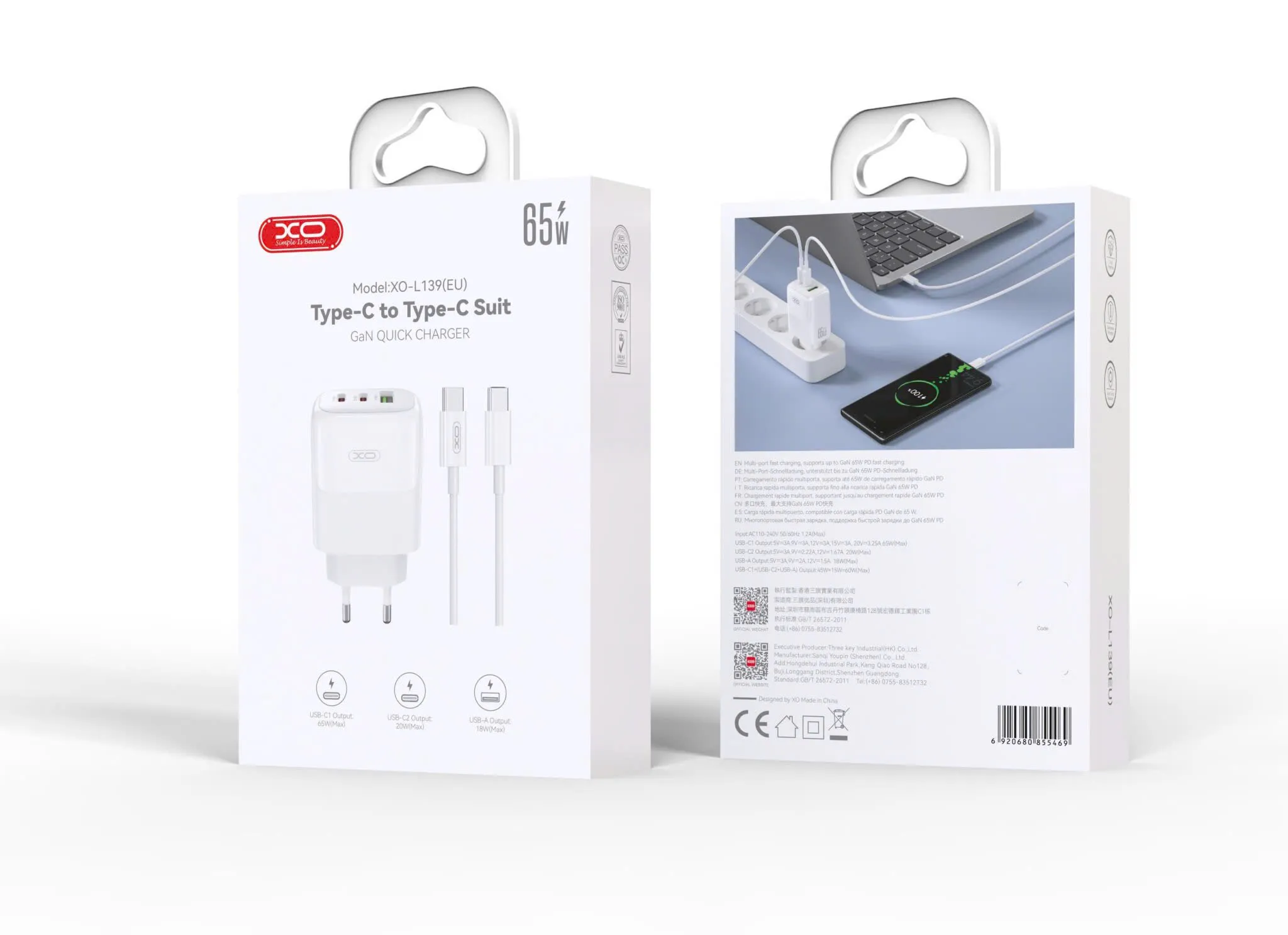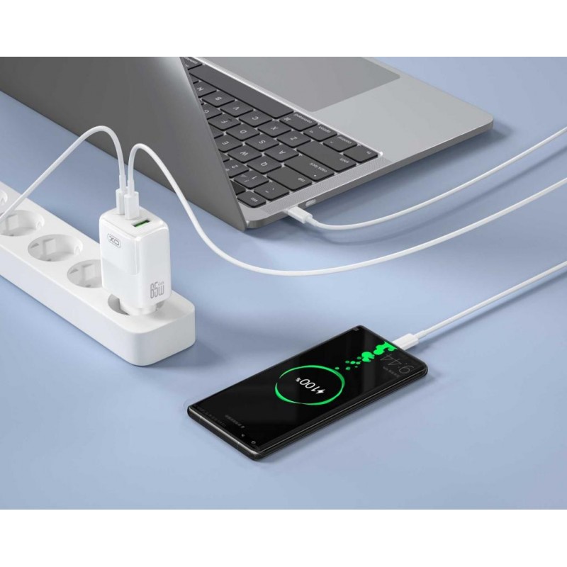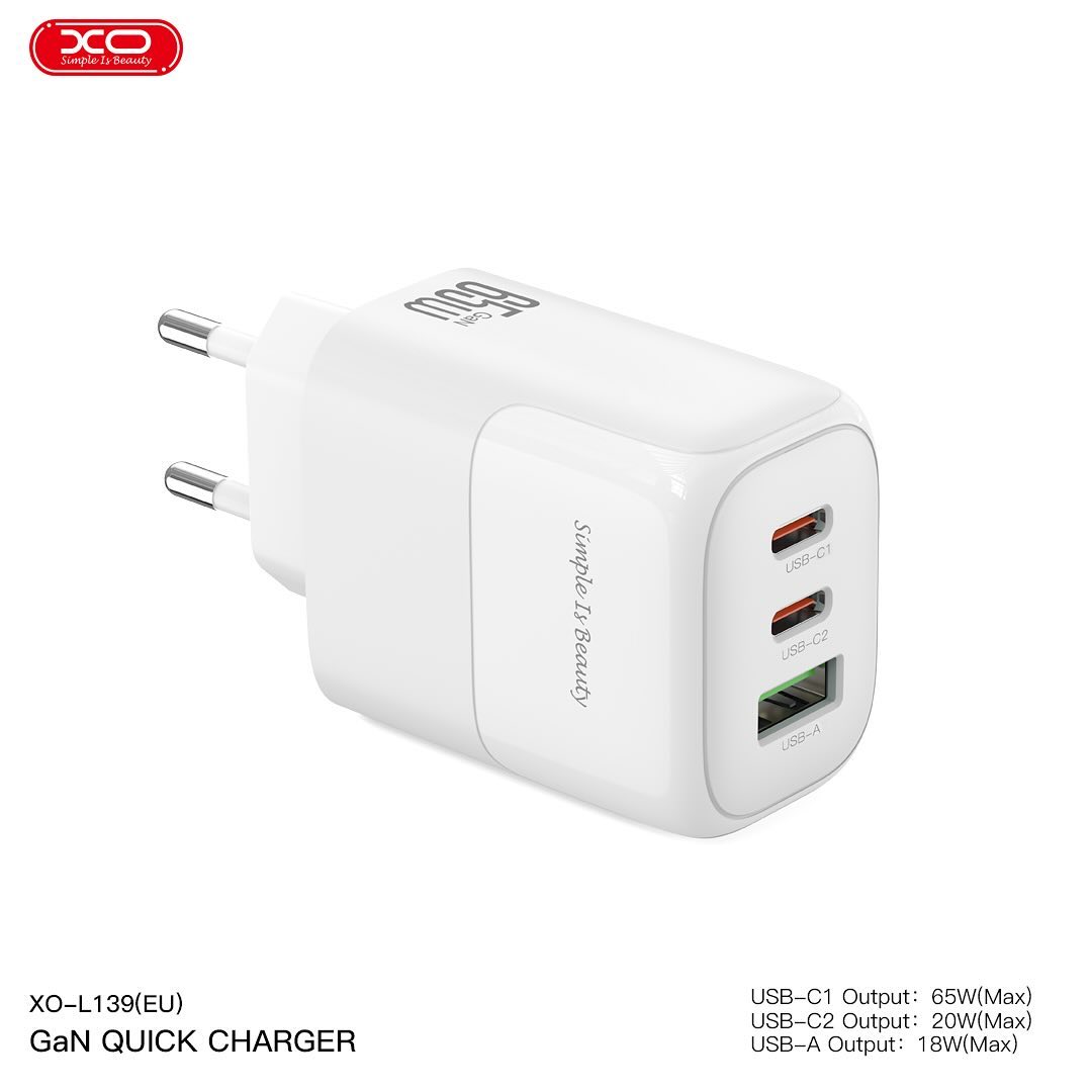 Bộ sạc nhanh 65W đa năng XO L139 EU - Sạc cùng lúc 3 thiết bị, kèm cáp sạc Type C