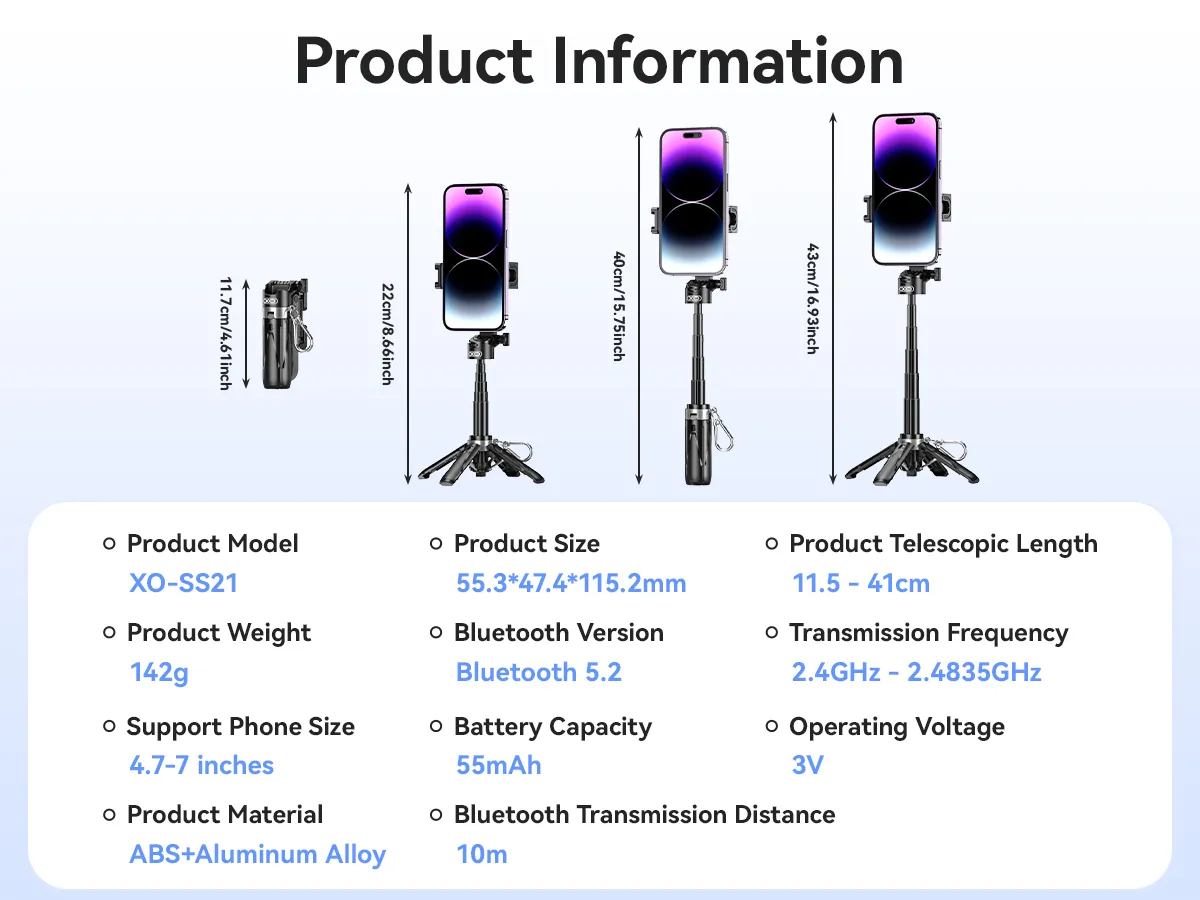 Gậy chụp ảnh có đèn XO SS21 được thiết kế tinh tế, gọn nhẹ nhưng vô cùng chắc chắn. Chiều dài thu gọn chỉ 11.5cm, bạn có thể dễ dàng bỏ túi mang đi khắp nơi. Chiều cao tối đa khi mở chân tripod là 41cm, đủ để bạn có được góc quay rộng và ổn định. Remote điều khiển từ xa có khoảng cách lên tới 10m, cho phép bạn tự do sáng tạo mà không bị giới hạn về không gian. Với dung lượng pin 55mAh và thời gian sạc chỉ khoảng 1 giờ, bạn có thể sử dụng thoải mái trong nhiều giờ liền.