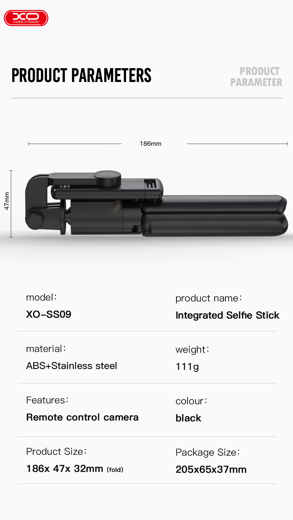 Được làm từ chất liệu ABS cao cấp, Gậy chụp ảnh Bluetooth XO SS09 không chỉ bền bỉ mà còn rất nhẹ, với trọng lượng chỉ 111g, giúp bạn dễ dàng mang theo mọi lúc, mọi nơi. Sản phẩm có thể gập lại với kích thước nhỏ gọn (186 * 47 * 32mm), giúp tiết kiệm không gian trong balo hoặc túi xách của bạn. Ngoài ra, với điều khiển từ xa tích hợp, bạn có thể dễ dàng chụp ảnh hoặc quay video mà không cần phải chạm vào điện thoại.
