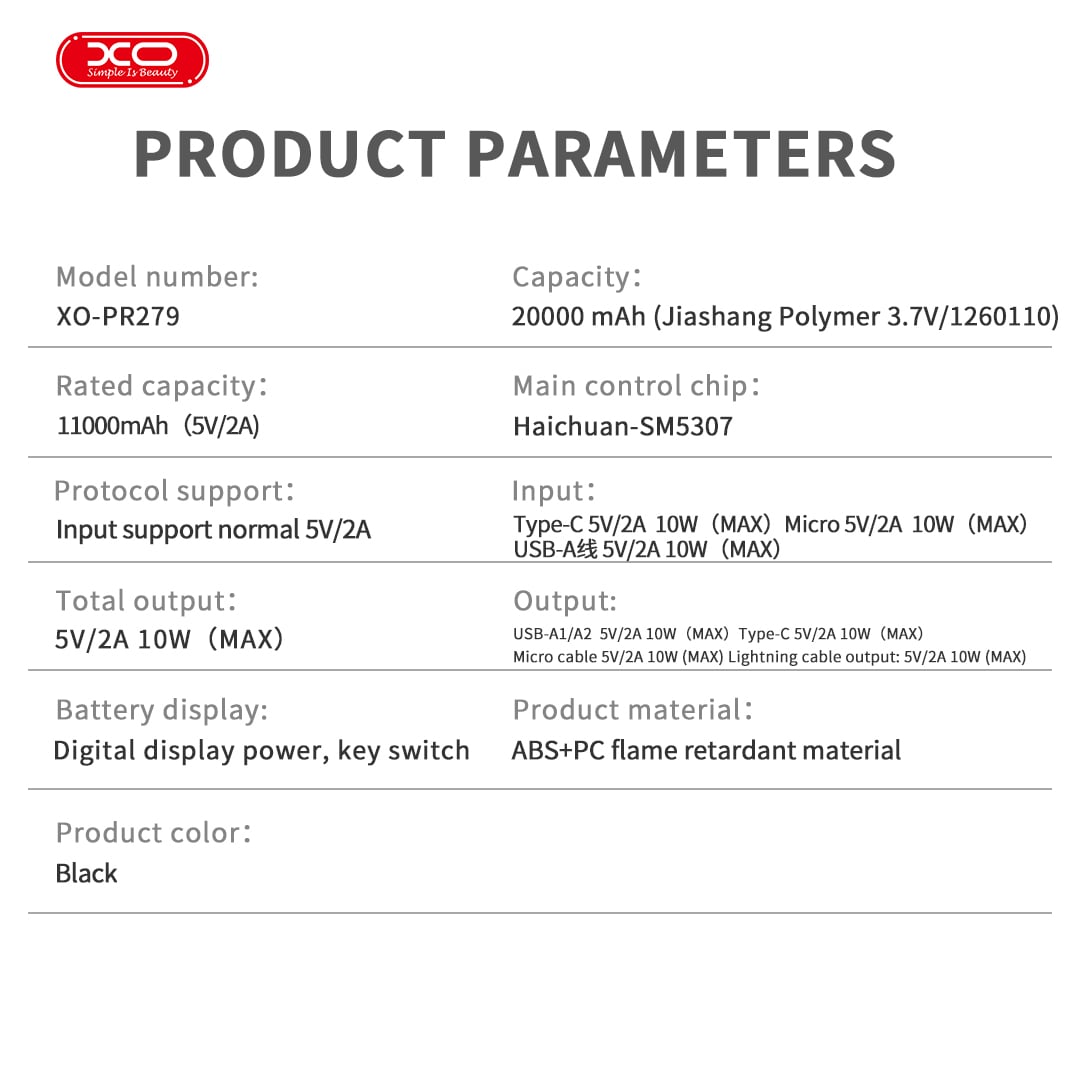 Tại sao bạn nên sở hữu sạc dự phòng XO PR279 ngay hôm nay. Đầu tiên chính là dung lượng thực tế cực kỳ ấn tượng. Với 20000mAh, bạn có thể thoải mái duy trì liên lạc và giải trí suốt nhiều ngày dài mà không cần tìm ổ điện. Đây là lựa chọn lý tưởng cho những chuyến du lịch, công tác hay dã ngoại. Thêm vào đó, màn hình kỹ thuật số hiển thị phần trăm pin chính xác giúp bạn chủ động kiểm soát năng lượng còn lại, thay vì phải đoán mò qua những chấm đèn mập mờ như các dòng pin rẻ tiền.